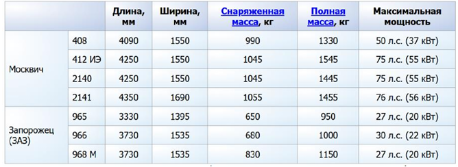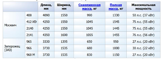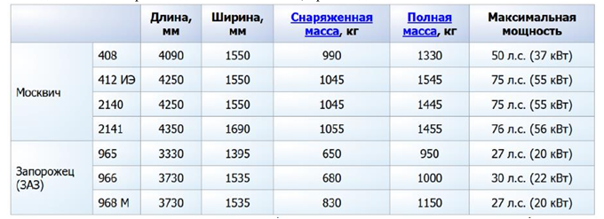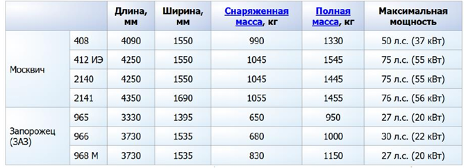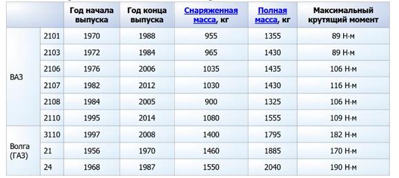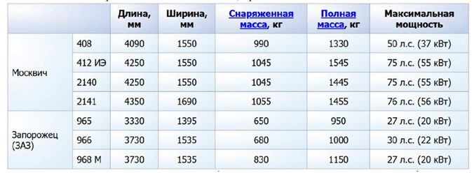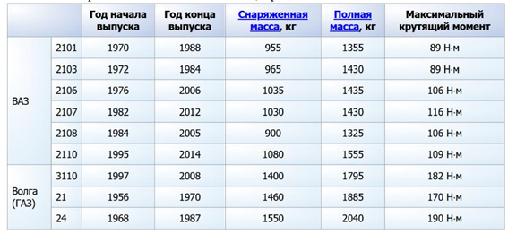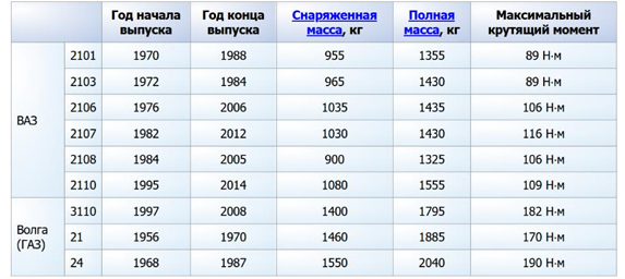 В таблице даны сведения о некоторых моделях автомобилей, производившихся в СССР и РФ.