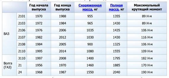 (Год начала выпуска, Год конца выпуска, Снаряженная масса, Полная масса, Максимальный крутящий момент)