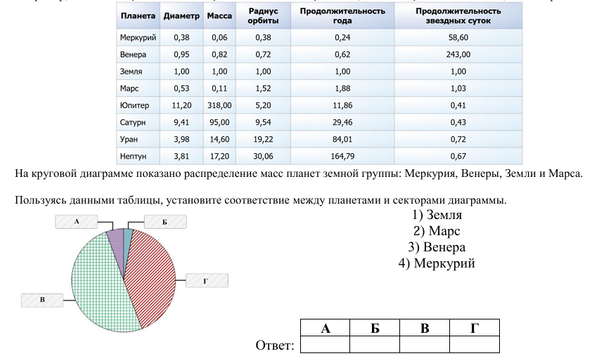 Решение: Из таблицы массы: Земля = 1.00, Венера = 0.82, Марс = 0.11, Меркурий = 0.06. На диаграмме сектора: В (самый большой) = Земля(1), А = Венера(3), Г = Марс(2), Б = Меркурий(4). Ответ: 2413 (по ключам).