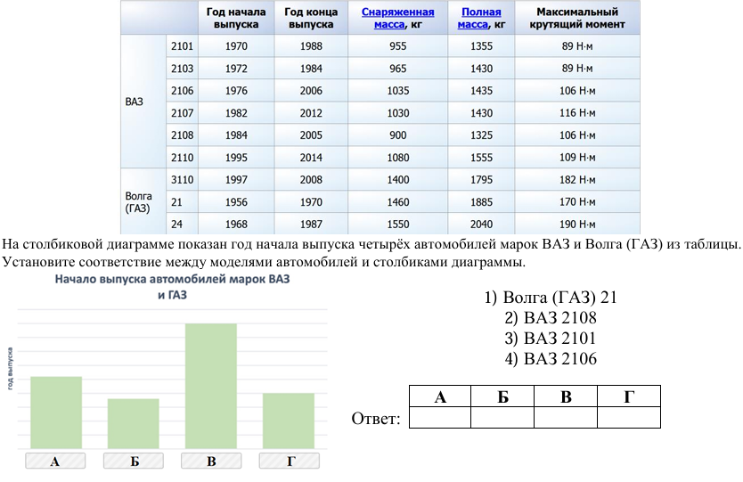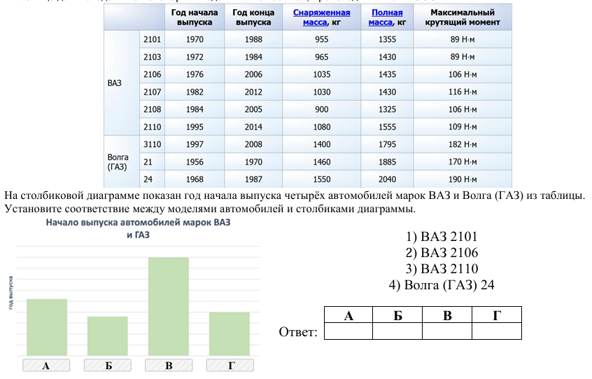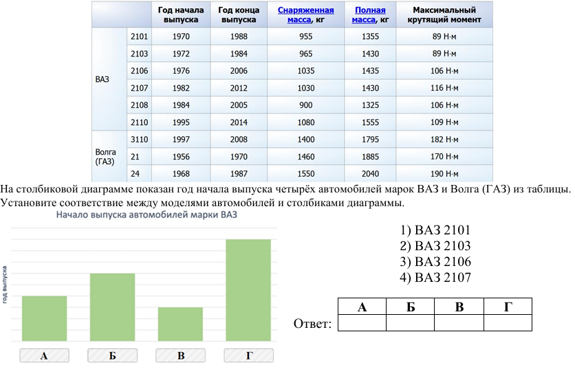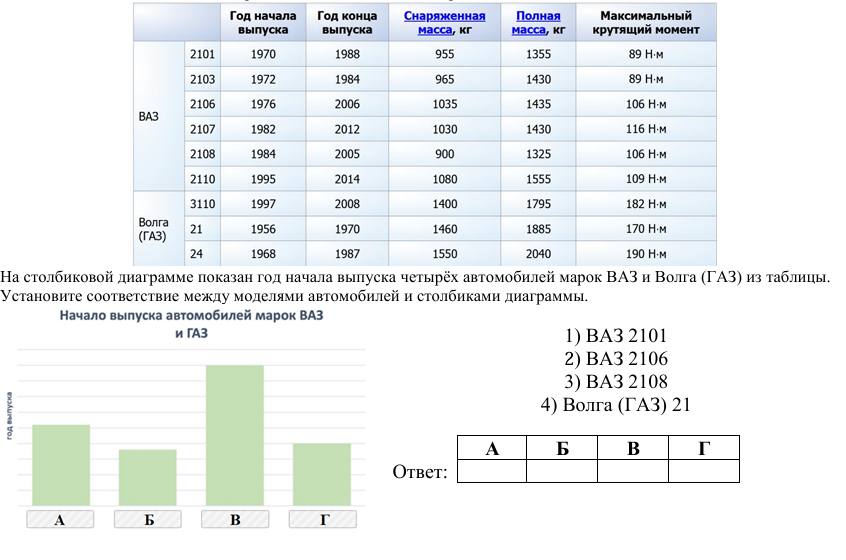 На столбиковой диаграмме показан год начала выпуска четырёх автомобилей марок ВАЗ и Волга (ГАЗ) из таблицы. Установите соответствие между моделями автомобилей и столбиками диаграммы.