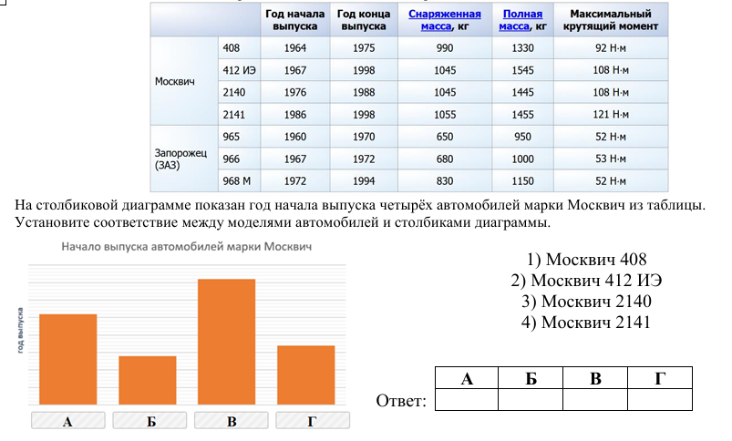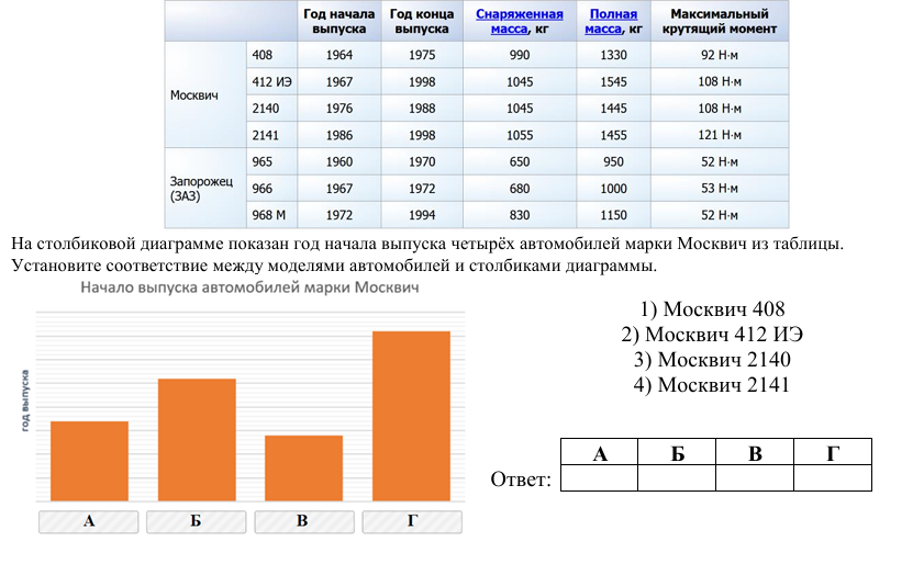 На столбиковой диаграмме показан год начала выпуска четырёх автомобилей марки Москвич. Установите соответствие.