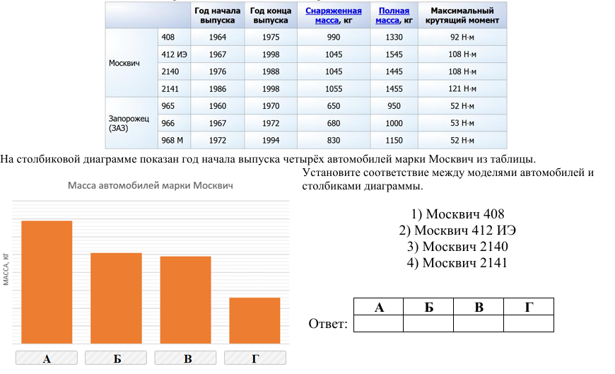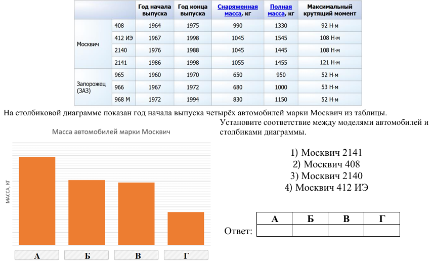 На столбиковой диаграмме показана масса четырёх автомобилей марки Москвич. Установите соответствие между моделями и столбиками.