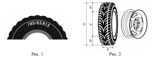 Автомобильное колесо представляет из себя металлический диск с установленной на него резиновой шиной. Диаметр диска совпадает с диаметром внутреннего отверстия в шине. Для маркировки автомобильных шин применяется единая система обозначений. Например, 195/65 R15. Первое число означает ширину шины в миллиметрах. Второе число — высота боковины шины в процентах от ширины шины. Буква R означает, что шина имеет радиальную конструкцию. За буквой R следует диаметр диска в дюймах (в одном дюйме 25,4 мм). Таким образом, общий диаметр колеса можно найти, зная диаметр диска и высоту боковины.