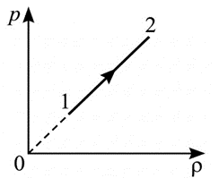 Из уравнения Менделеева-Клапейрона: p = (ρ / M) · R · T. Если график прямой и проходит через начало координат (p пропорционально плотности), то температура T = const (процесс изотермический). Стрелка идет вправо — плотность растет, значит объем V падает (газ сжимают).