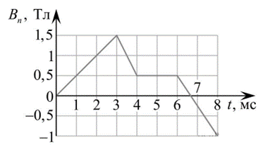 1. Интервал 6-8 мс: ΔB = -1 - 0,5 = -1,5 Тл. Δt = 2 мс = 2 · 10-3 с. Модуль ЭДС = 8 · 10-3 · (1,5 / (2 · 10-3)) = 6 В. Верно.