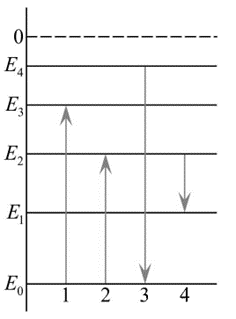 Б) Излучение — переход сверху вниз (стрелки 3 и 4). Наибольшая энергия — это самая длинная стрелка вниз. Это стрелка 3 (из E4 в E0).