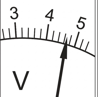 Находим цену деления. Между отметками 4 и 5 В находится 5 промежутков. Цена деления = (5 - 4) / 5 = 0,2 В.