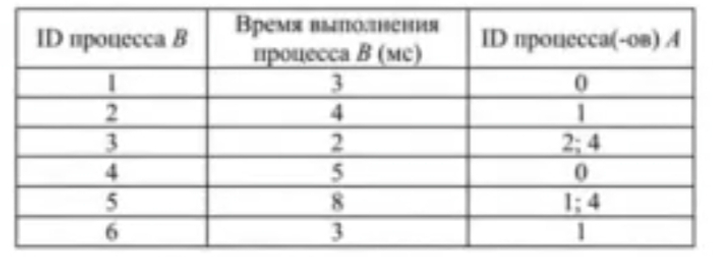 Задание выполняется с использованием прилагаемых файлов. В файле содержится информация о совокупности вычислительных процессов, которые могут выполняться параллельно или последовательно. Приостановка выполнения процесса не допускается. Будем говорить, что процесс В зависит от процесса А, если для выполнения процесса в необходимы результаты выполнения процесса А. В этом случае процессы А и В могут выполняться только последовательно. Информация о процессах представлена в файле в виде таблицы. В первом столбце таблицы указан идентификатор процесса (ID), во втором столбце таблицы время его выполнения в миллисекундах, в третьем столбце перечислены с разделителем «;» ID процессов, от которых зависит данный процесс. Если процесс независимый, то в таблице указано значение 0. Определите максимальную продолжительность отрезка времени (в мс), в течение которого возможно одновременное выполнение пяти процессов, при условии, что все независимые друг от друга процессы могут выполняться параллельно. Типовой пример организации данных в файле: