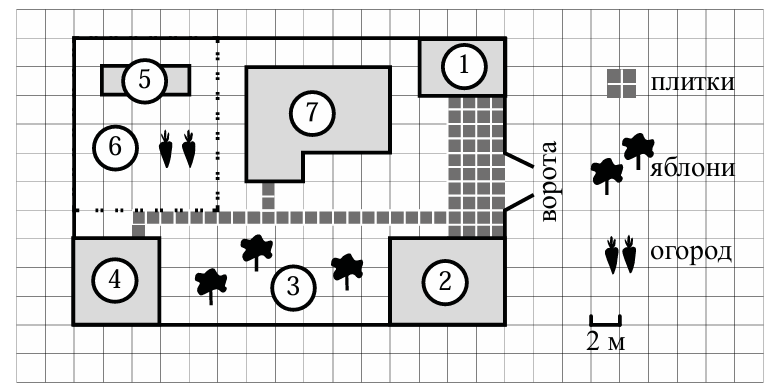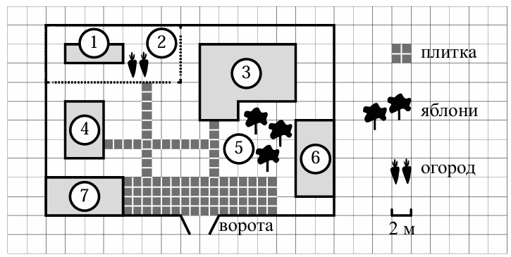На плане изображено домохозяйство по адресу: с. Авдеево, 3-й Поперечный пер., д. 13 (сторона каждой клетки на плане равна 2 м). Участок имеет прямоугольную форму. Выезд и въезд осуществляются через единственные ворота. При входе на участок справа от ворот находится баня, а слева гараж, отмеченный на плане цифрой 7. Площадь, занятая гаражом, равна 32 кв. м. Жилой дом находится в глубине территории. Помимо гаража, жилого дома и бани, на участке имеется сарай, расположенный рядом с гаражом, и теплица, построенная на территории огорода (огород отмечен цифрой 2). Перед жилым домом имеются яблоневые посадки. Все дорожки внутри участка имеют ширину 1 м и вымощены тротуарной плиткой размером 1 м x 1 м. Между баней и гаражом имеется площадка площадью 64 кв. м, вымощенная плиткой такого же размера, но другой фактуры и цвета. К домохозяйству подведено электричество. Имеется магистральное газоснабжение.