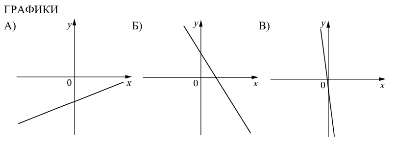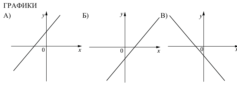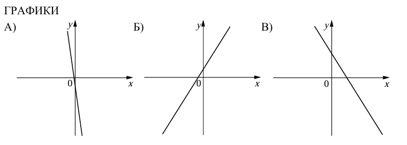 На рисунках изображены графики функций вида y = kx + b. Установите соответствие между графиками функций и знаками коэффициентов k и b.