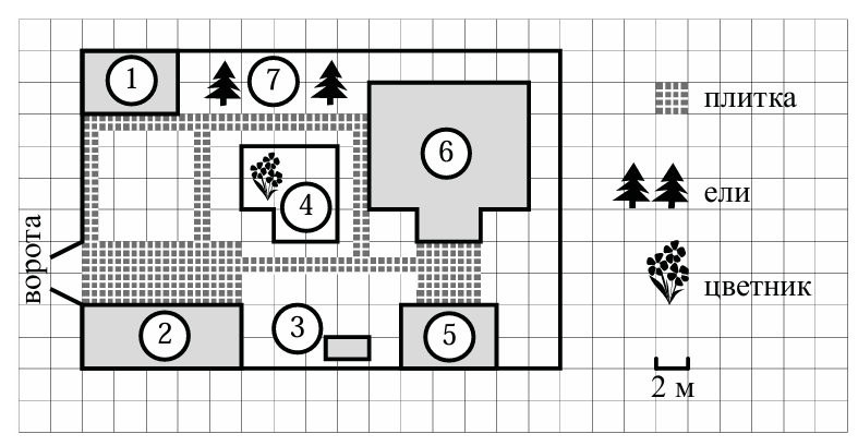 На плане изображено домохозяйство по адресу: СНТ «Прибор», 2-я Линия, д. 26 (сторона каждой клетки на плане равна 2 м). Участок имеет прямоугольную форму. Выезд и въезд осуществляются через единственные ворота. При входе на участок справа от ворот находится гараж, а слева в углу участка расположен сарай, отмеченный на плане цифрой 1. Площадь, занятая сараем, равна 24 кв. м. Жилой дом находится в глубине территории и обозначен на плане цифрой 6. Помимо гаража, жилого дома и сарая, на участке имеется летняя беседка, расположенная напротив входа в дом, и мангал рядом с ней. На участке также растут ели. В центре участка расположен цветник. Все дорожки внутри участка имеют ширину 1 м и вымощены тротуарной плиткой размером 50 см x 50 см. Перед гаражом и между домом и беседкой имеются площадки площадью 40 и 16 кв. м соответственно, вымощенные такой же плиткой. К домохозяйству подведено электричество. Имеется магистральное газоснабжение.