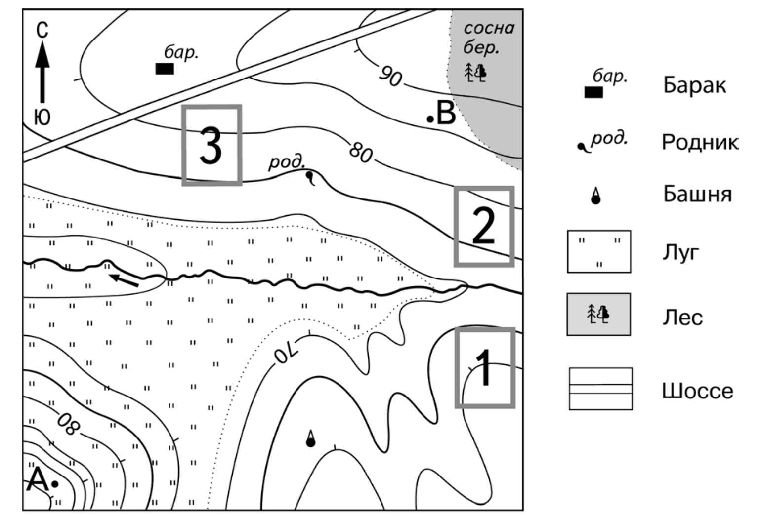 Российский фермер выбирает участок для закладки нового фруктового сада. Ему нужен участок, на котором весной рано сходит снег, а летом почва лучше всего прогревается солнцем. Он также должен иметь расположение, удобное для вывоза собранного урожая на консервный завод. Определите, какой из участков, обозначенных на карте цифрами 1, 2 и 3, больше всего отвечает указанным требованиям. Для обоснования Вашего ответа приведите два довода.