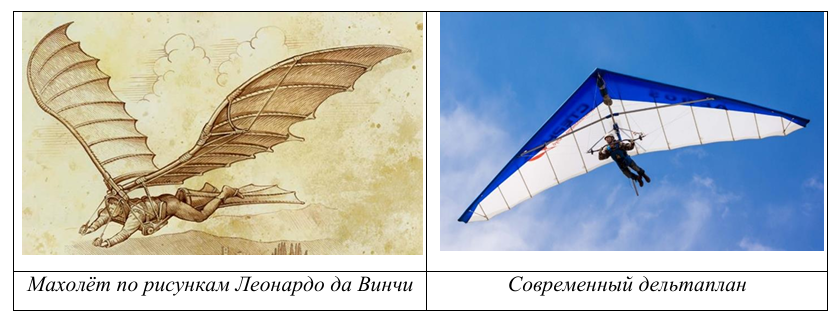 Леонардо измерил вес утки и длину её крыльев. И подсчитал, что если вес махолёта с человеком будет 140 килограммов, то ему потребуются крылья длиной примерно 12 метров! Убедившись, что людям не хватит сил, чтобы махать такими огромными крыльями, он стал обдумывать конструкцию аппарата с неподвижными крыльями. Двигатель ещё не изобрели, и Леонардо решил использовать силу ветра, чтобы летательный аппарат мог без всякого двигателя парить в небе, как орлы. Он сделал чертёж дельтаплана. В наше время по нему сделали дельтаплан, который взлетел.