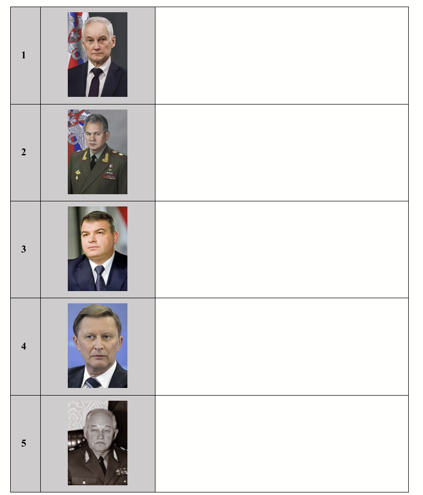 Задание 1. Напишите фамилию, имя, отчество Министров обороны Российской Федерации