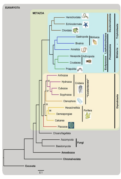 На рисунке представлено филогенетическое дерево Metazoa (многоклеточных животных),