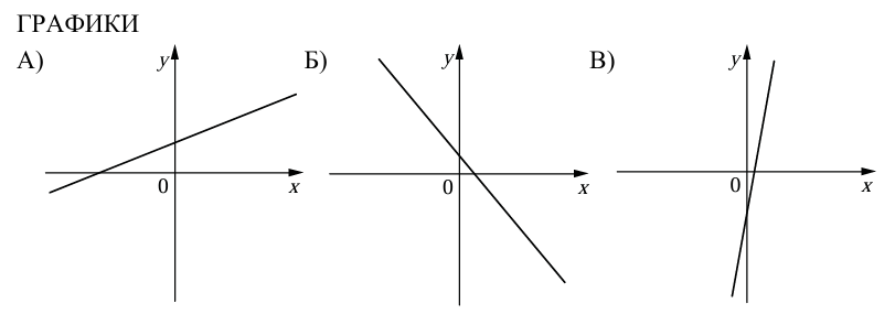 На рисунках изображены графики функций вида y = kx + b. Установите соответствие между графиками функций и знаками коэффициентов k и b.